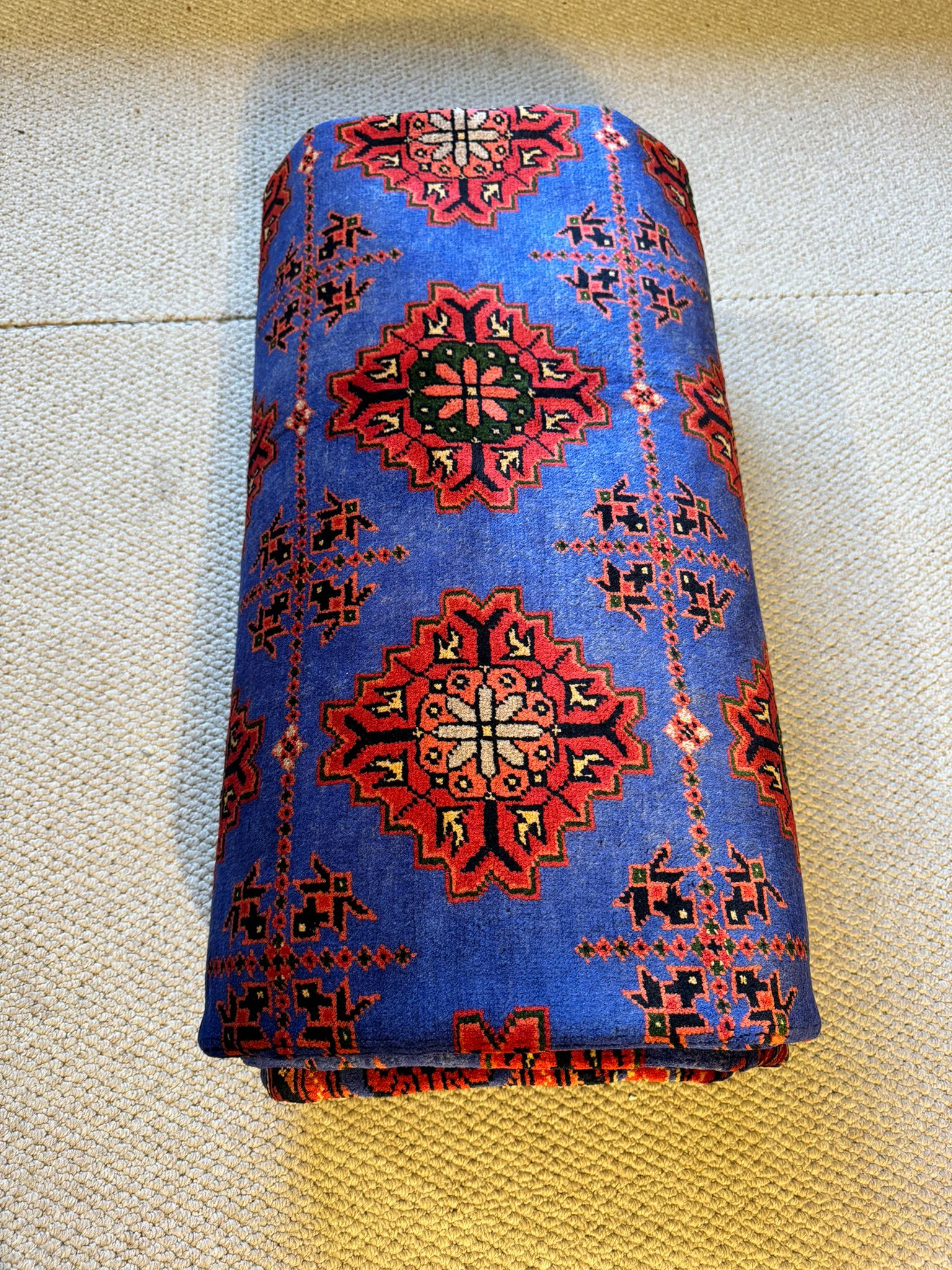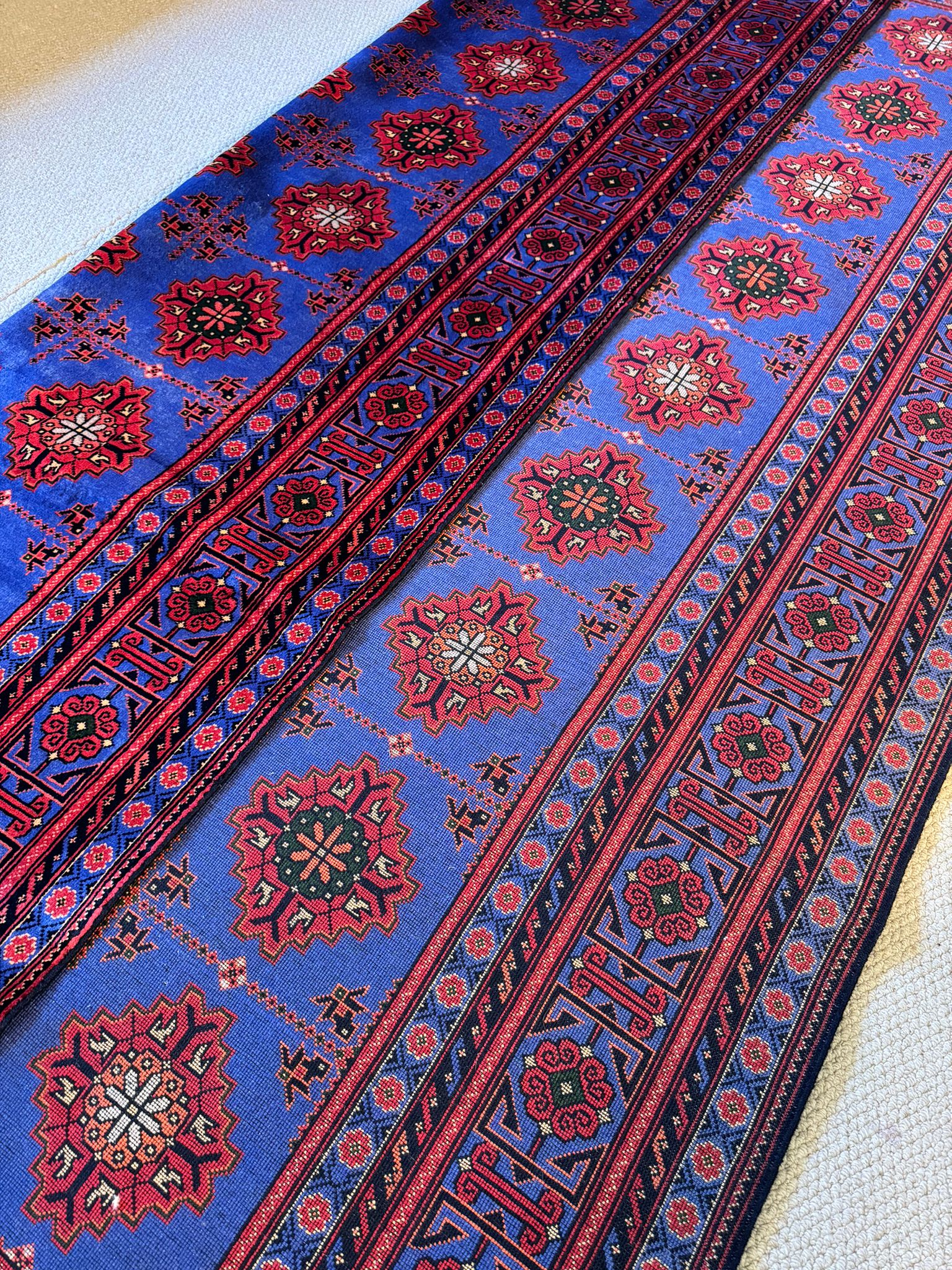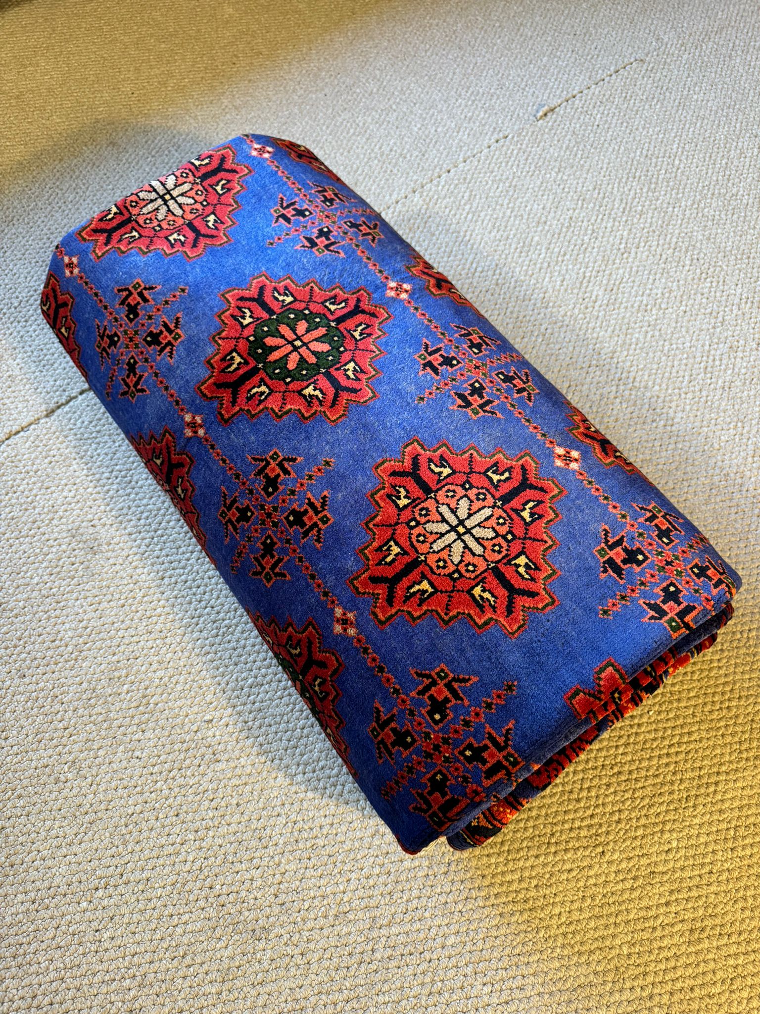 The vibrant blue backdrop is adorned with intricate, symmetrical Yamoot patterns, highlighted with crimson and accented with touches of green and ivory. These designs not only add elegance to your space but also tell a story of centuries-old weaving traditions.