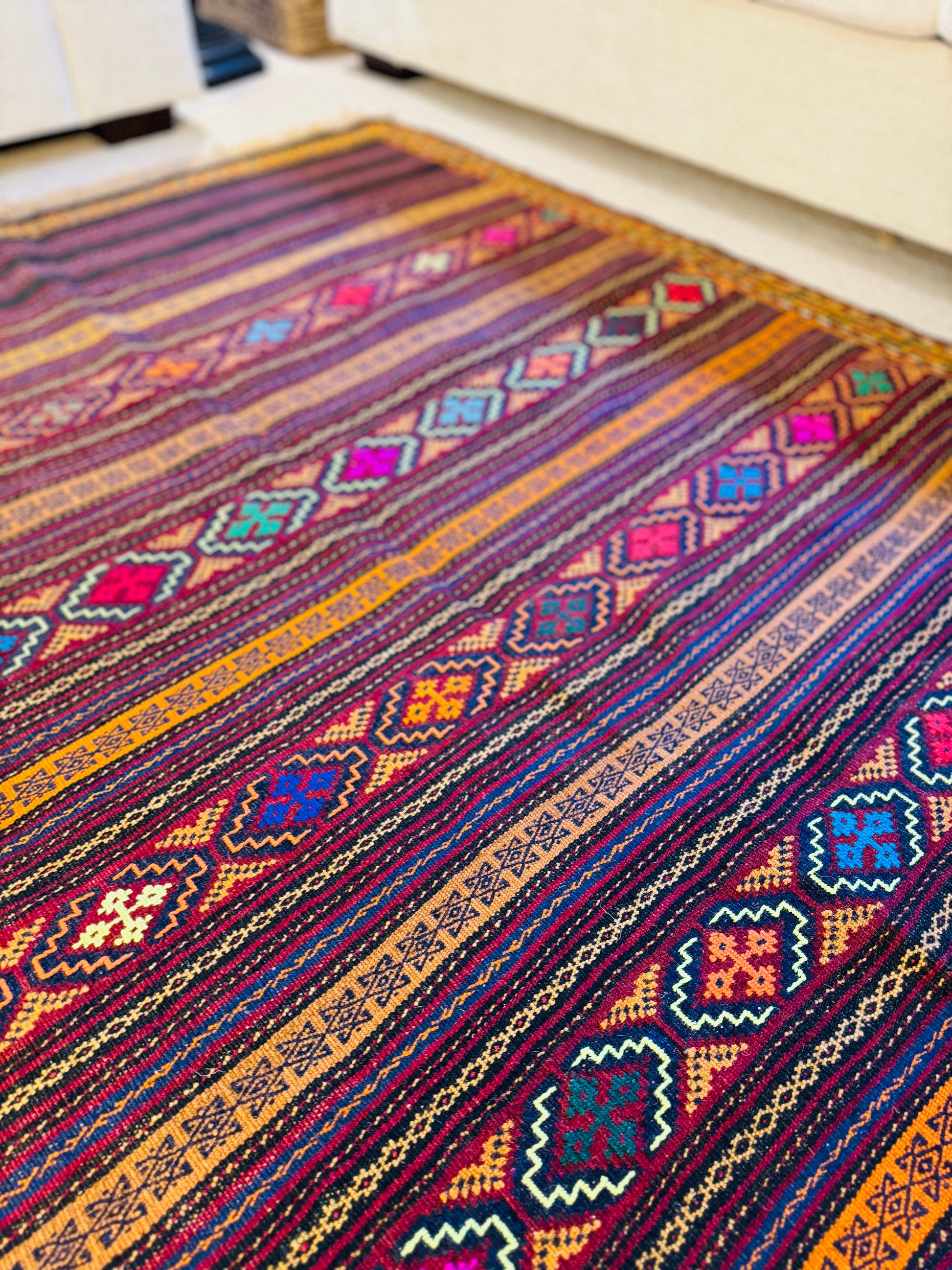 Add a touch of traditional elegance to your home with this 7x4 ft Laghari rug, handwoven in Badghis. The intricate Laghari design features rich, earthy tones and vibrant geometric patterns that reflect the skilled craftsmanship of Afghan weavers. The rug’s textural depth and natural dyes create a unique piece that enhances any room’s decor.