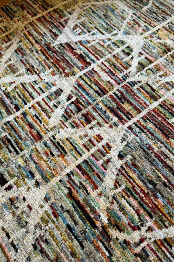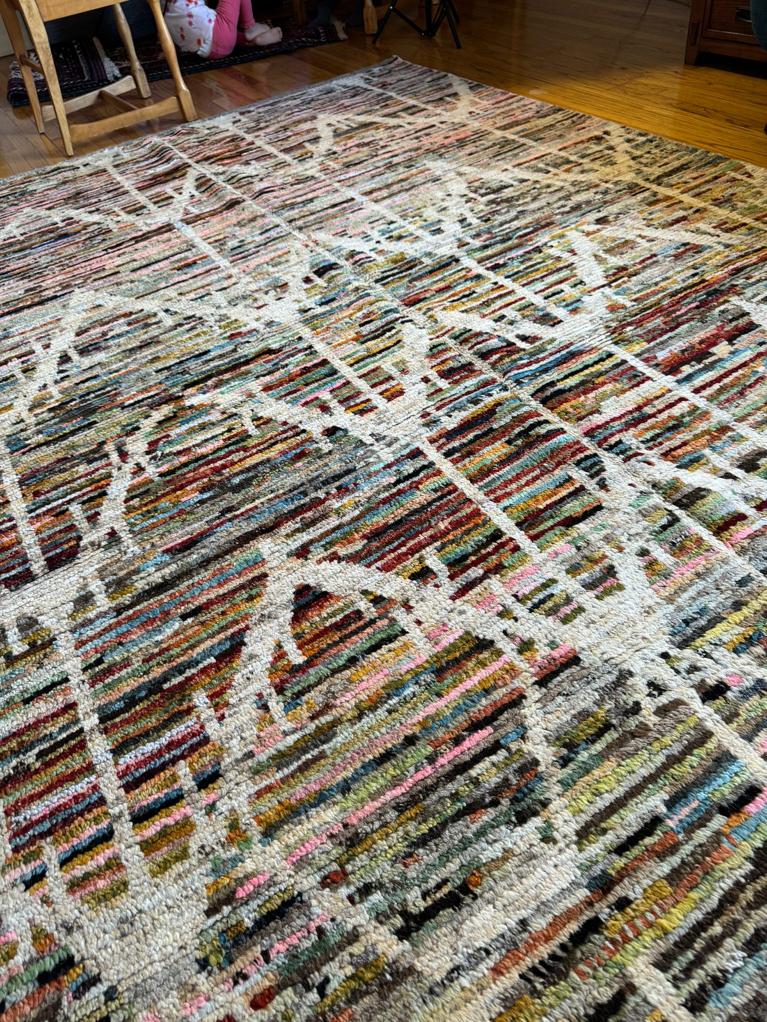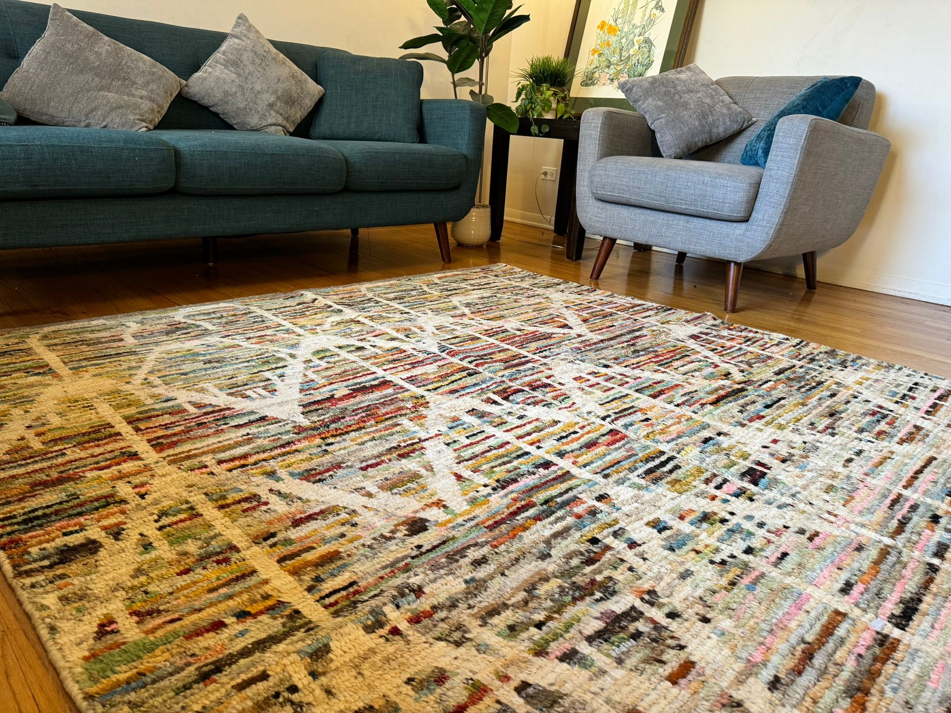 The Modern Art-Inspired Gabbeh Rug, sized at 10 by 6.8 feet, is a stunning creation by the artistic women of Kabul's western region. This hand-knotted masterpiece draws its essence from the modern decor of luxury homes, marrying traditional design elements with the boldness of contemporary art. It is a versatile piece that brings a fresh and vibrant energy to any space, with a palette of colors that can accentuate the modernity of a loft or add a splash of sophistication to a classic household. Each strand is knotted with intention, building a rug that is as durable as it is beautiful.