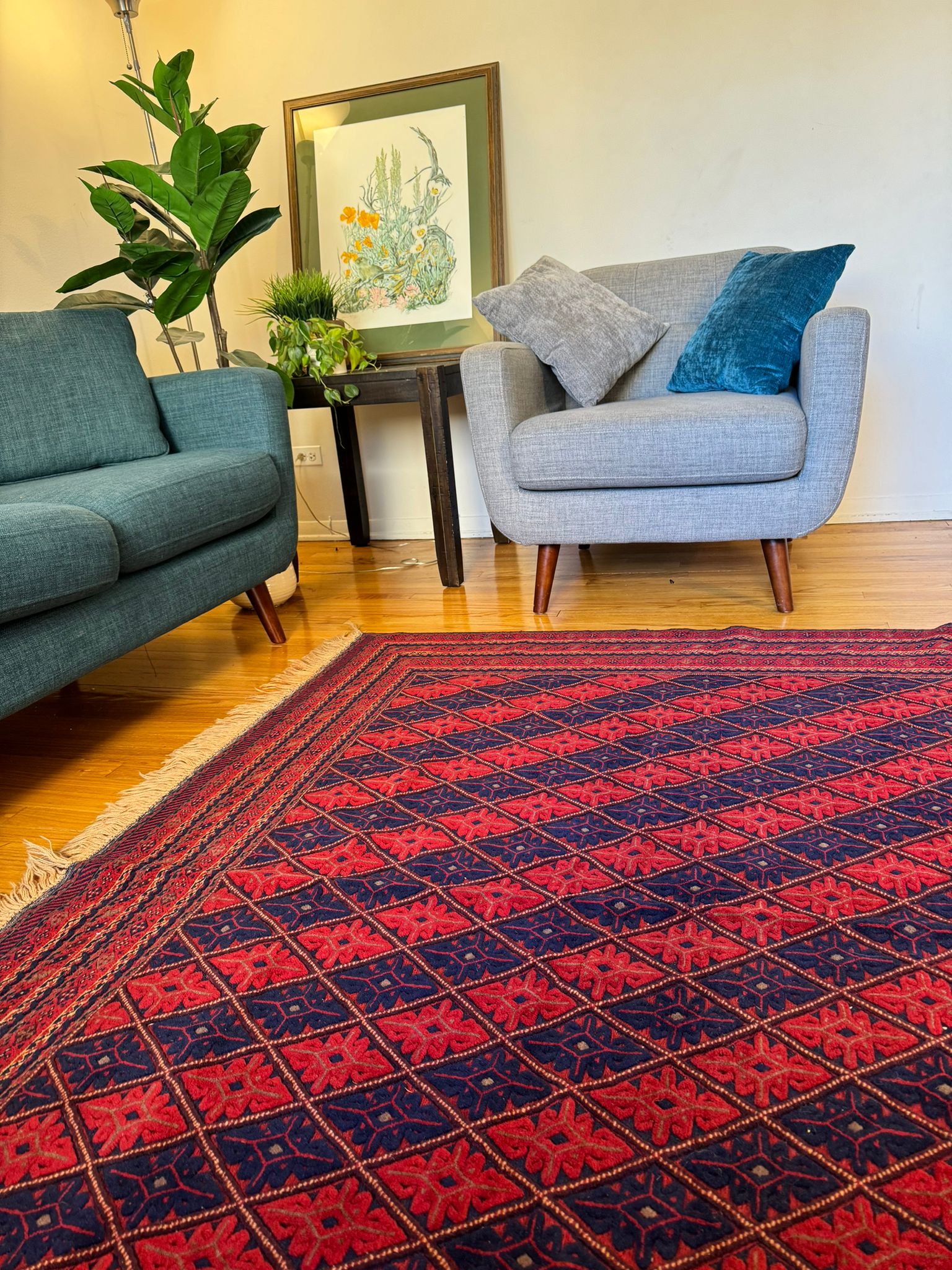 The Herat Nakhunak Rug embodies a masterful blend of Kilim and traditional rug weaving techniques, handcrafted by the skilled artisan women of Herat. This stunning piece, sized at 10 by 7.2 feet, is a distinguished addition to our collection, celebrated for its vibrant fusion of lapis blue and pomegranate red colors. The meticulous hand-knotting process results in unparalleled quality, with a design that captures the essence of both Kilim and rug artistry. This rug is a statement of cultural pride and impeccable craftsmanship, ideal for those who seek to infuse their homes with the spirit of Afghan heritage.